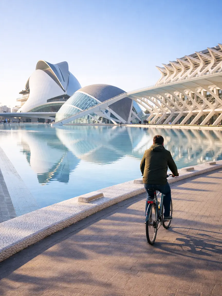 The white curves of the Hemisfèric, the glass wings of the Museu de les Ciències, the elegant lines of the Umbracle — all of them appear sharper under the winter sun. The water pools reflect the buildings with mirror-like precision. The sky is a deeper blue, without summer humidity softening the edges. And because crowds are minimal, you can cycle through the entire area, stopping anywhere, circling around the bridges, riding toward the Marina without worrying about weaving through selfie sticks and slow-moving groups.