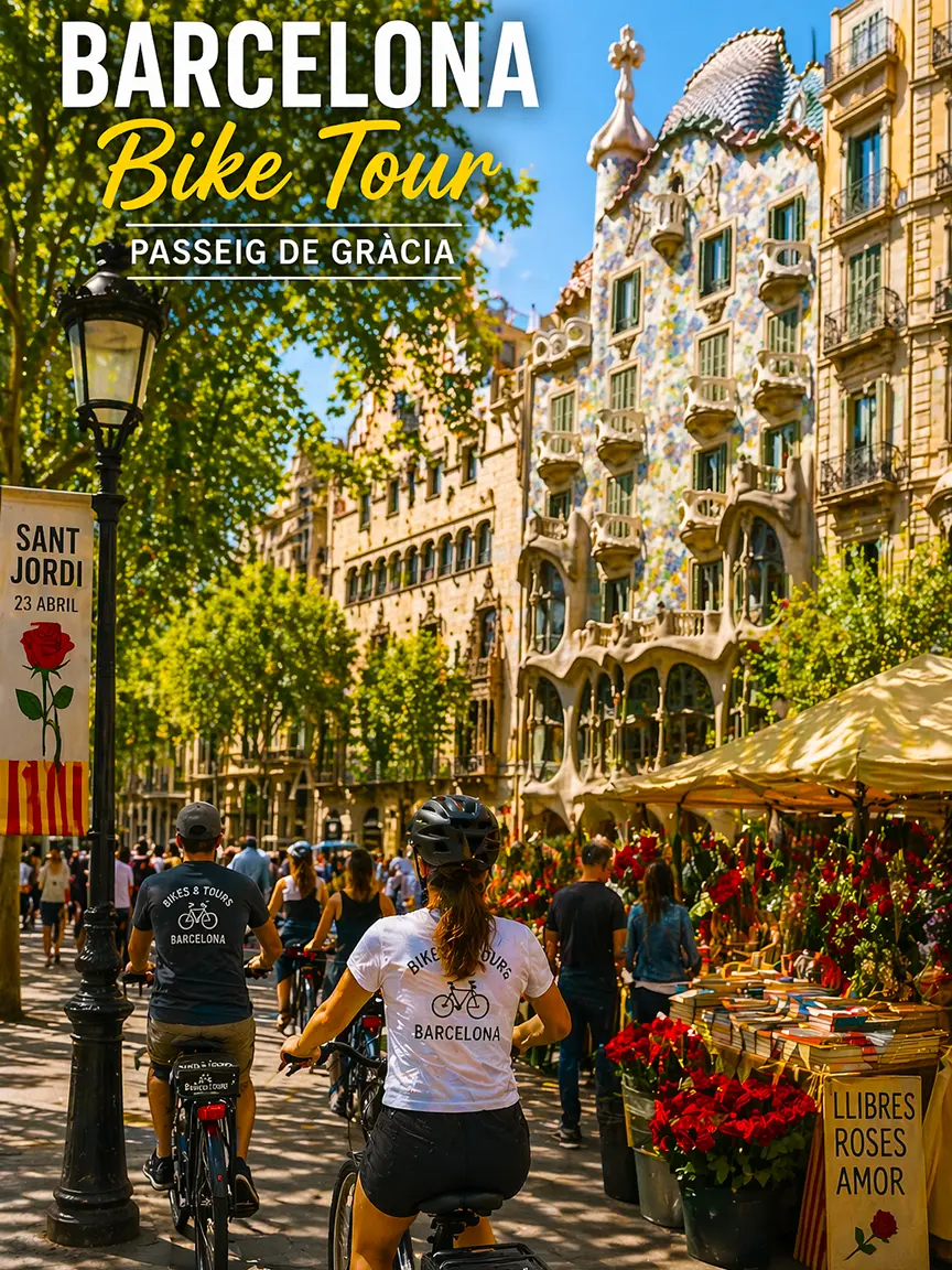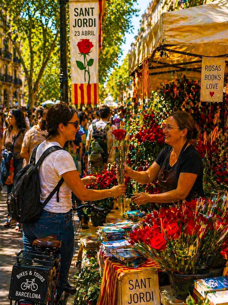 Every year on April 23, Barcelona transforms into one giant open-air market of books and roses. Streets fill with flower stalls, author signings, and crowds of locals exchanging gifts with the people they love. It’s the city’s most romantic and literary day of the year — and one of the most chaotic on foot, which is why a Sant Jordi Barcelona Bike Tour is one of the best ways to experience it.