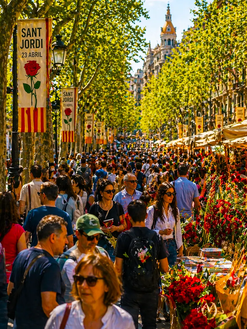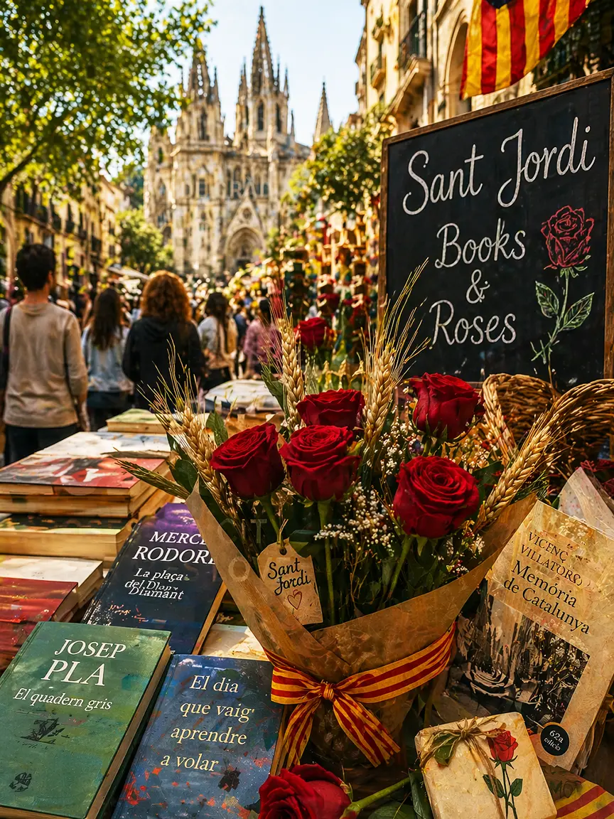 Sant Jordi (Saint George) is the patron saint of Catalonia. On April 23, Catalans celebrate his feast day with a tradition unlike anything else in Europe: men give women roses, women give men books, and the entire city comes alive with hundreds of stalls selling both.